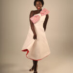 The Bow dress features a one shoulder and half circle midi skirt. The dress is made from cotton/nylon fabric with red lining. A big signature embroidery bow on the neckline and shoulder. 10% of each purchase will be donated to NGOs to run programs that would empower women in Australia to enter the fashion industry and finding employment.