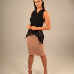 The square peplum top is made from black viscos lace, blush wool and silk lining, this top feature a V neckline, sleeveless with a back zipper. 10% of each purchase will be donated to NGOs to run programs that would empower women in Australia to enter the fashion industry and finding employment.