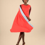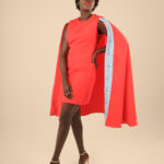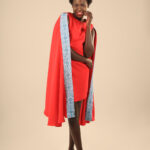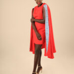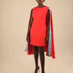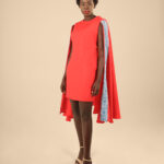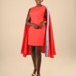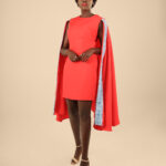 The Cape dress is made from Cotton/Nylon fabric, this dress features a pencil dress, round neck, sleeveless with a side zipper and a round cape with our signature Embroidery.